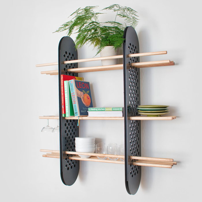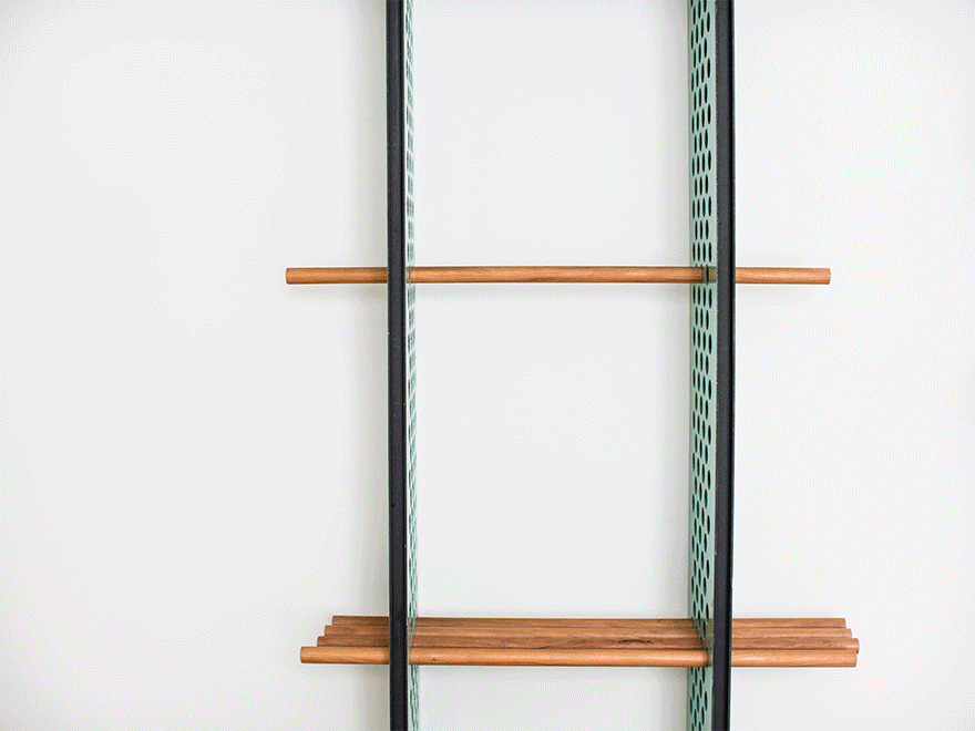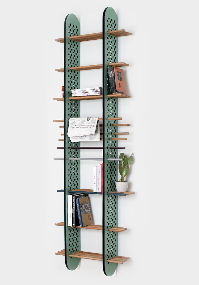 This shelving unit offers number of storage solutions for a variety of spaces: from a library to a child’s bedroom to display knick knacks, a fun kitchen unit or bathroom vanity store. It’s enamelled perforated fins enable you to arrange the dowels as you so wish creating a personalised and potentially ever changing shelving unit.