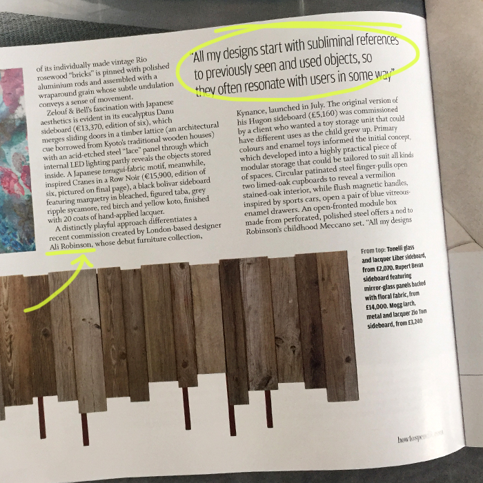The October issue of the Financial Times Superior Interiors magazine features London Based Furniture Designer Ali Robinson and one of his fabulous furniture designs: sideboard – Hugon.